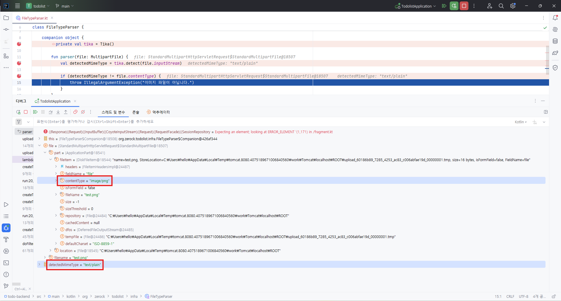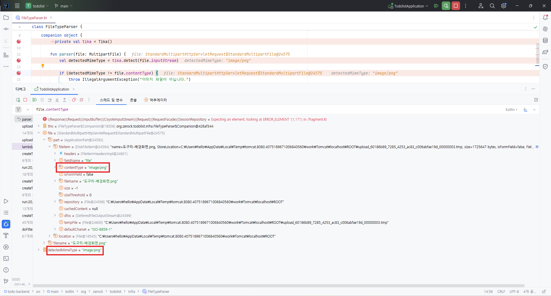 임의로 변경하지 않은 이미지(.png) 파일을 업로드하면 contentType과 MIME type이 일치하기 때문에 예외를 발생시키지 않는다.