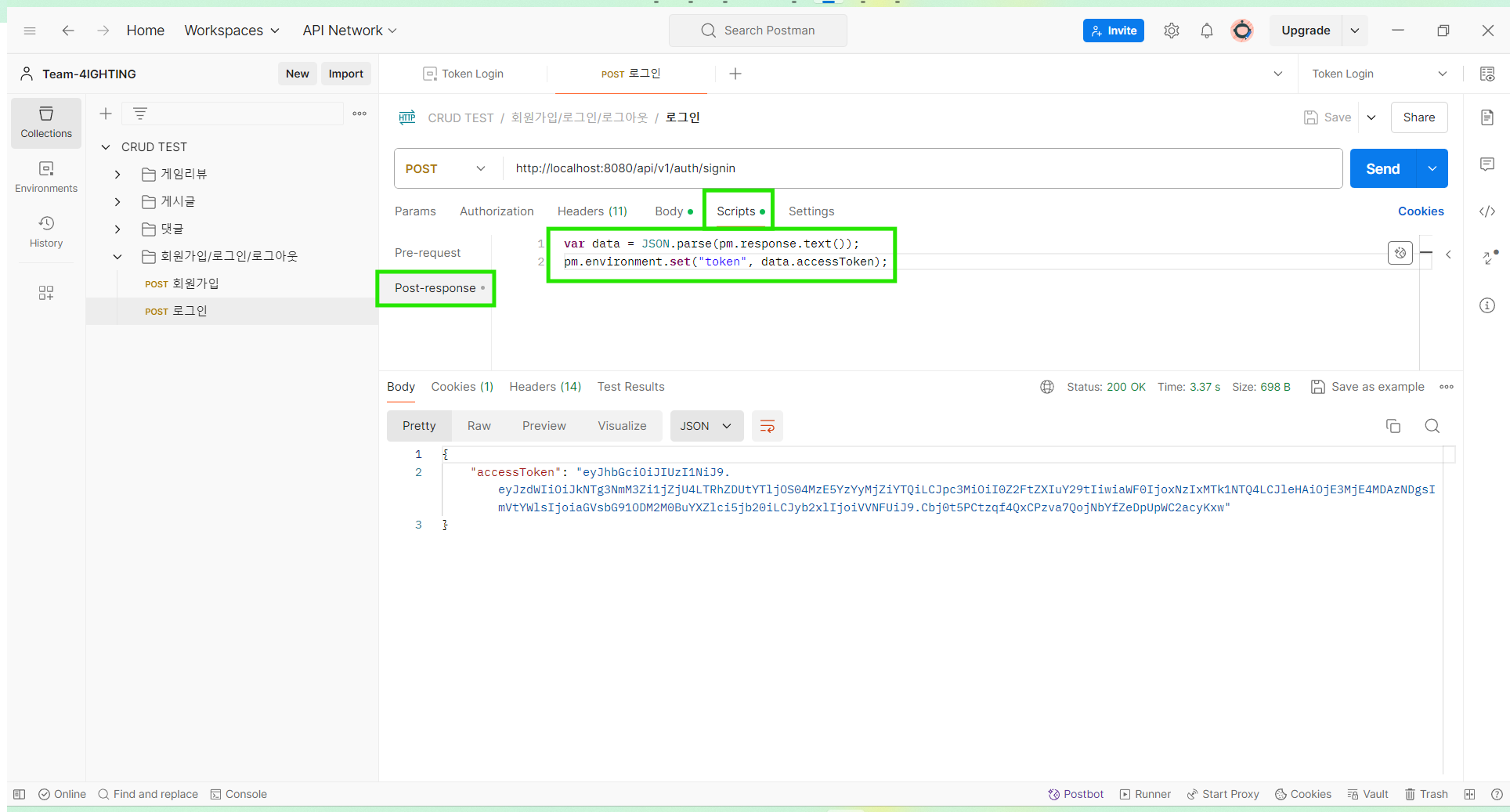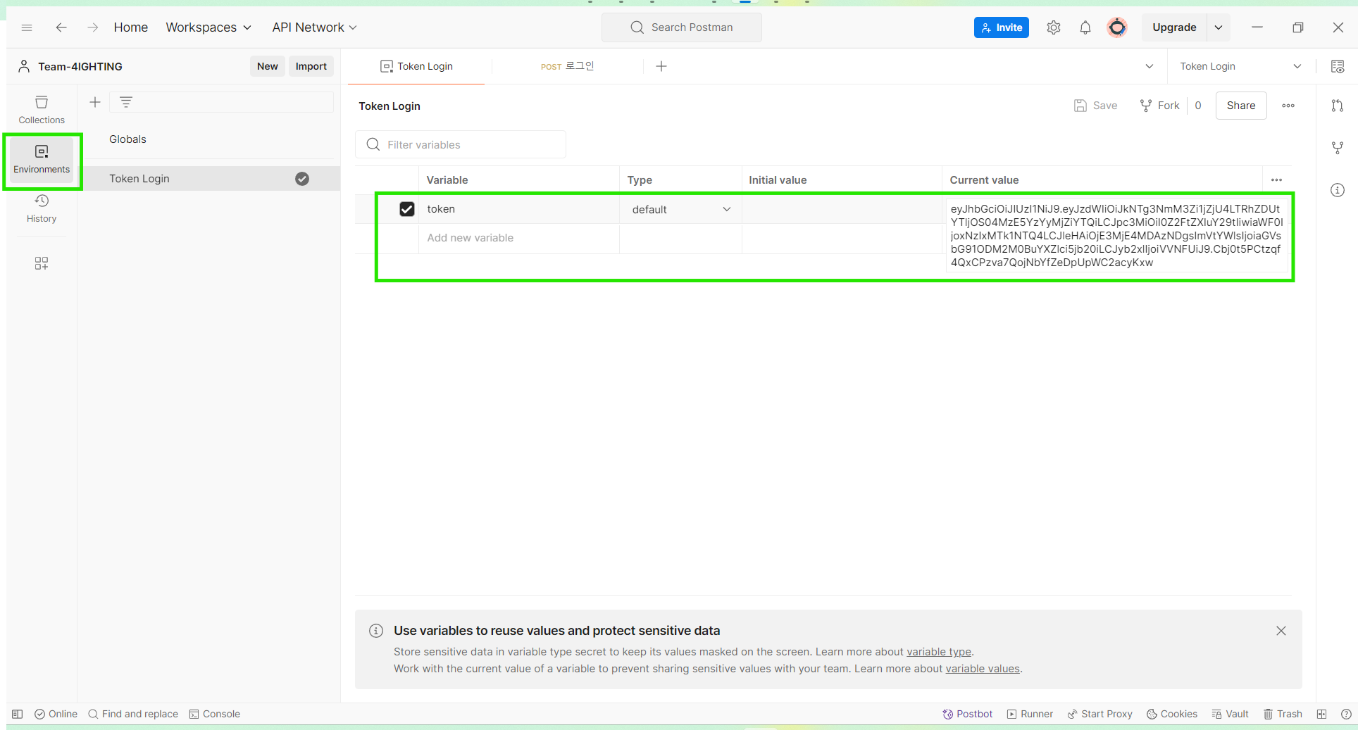 PostMan을 사용하면서 Token을 직접 추가하는 방식으로 사용했었는데 이번에 Token을 환경 변수로 설정하고 자동 갱신될 수 있게 하는 방법을 알게 되었다.