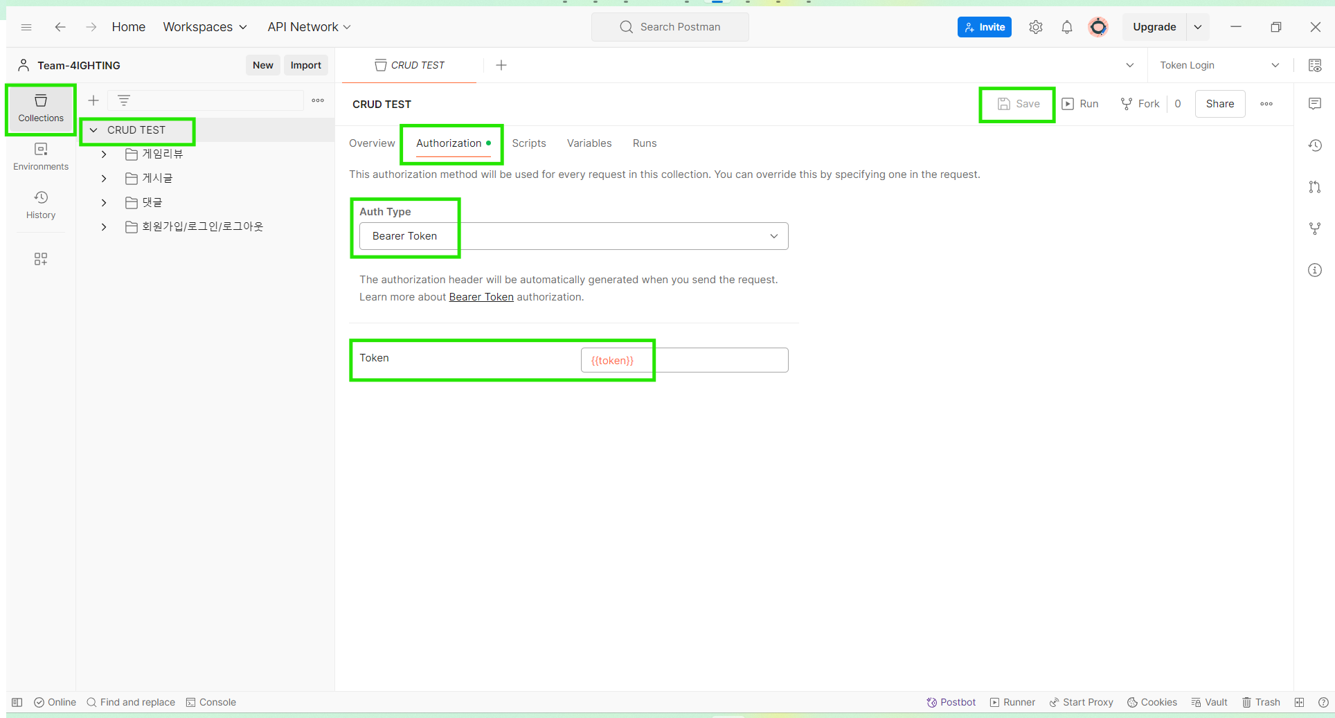 [Collections] → 적용할 폴더 선택 → [Authorization] → [Auth type]을 Bearer Token으로 설정 → [Token]에 {{변수명}} 입력