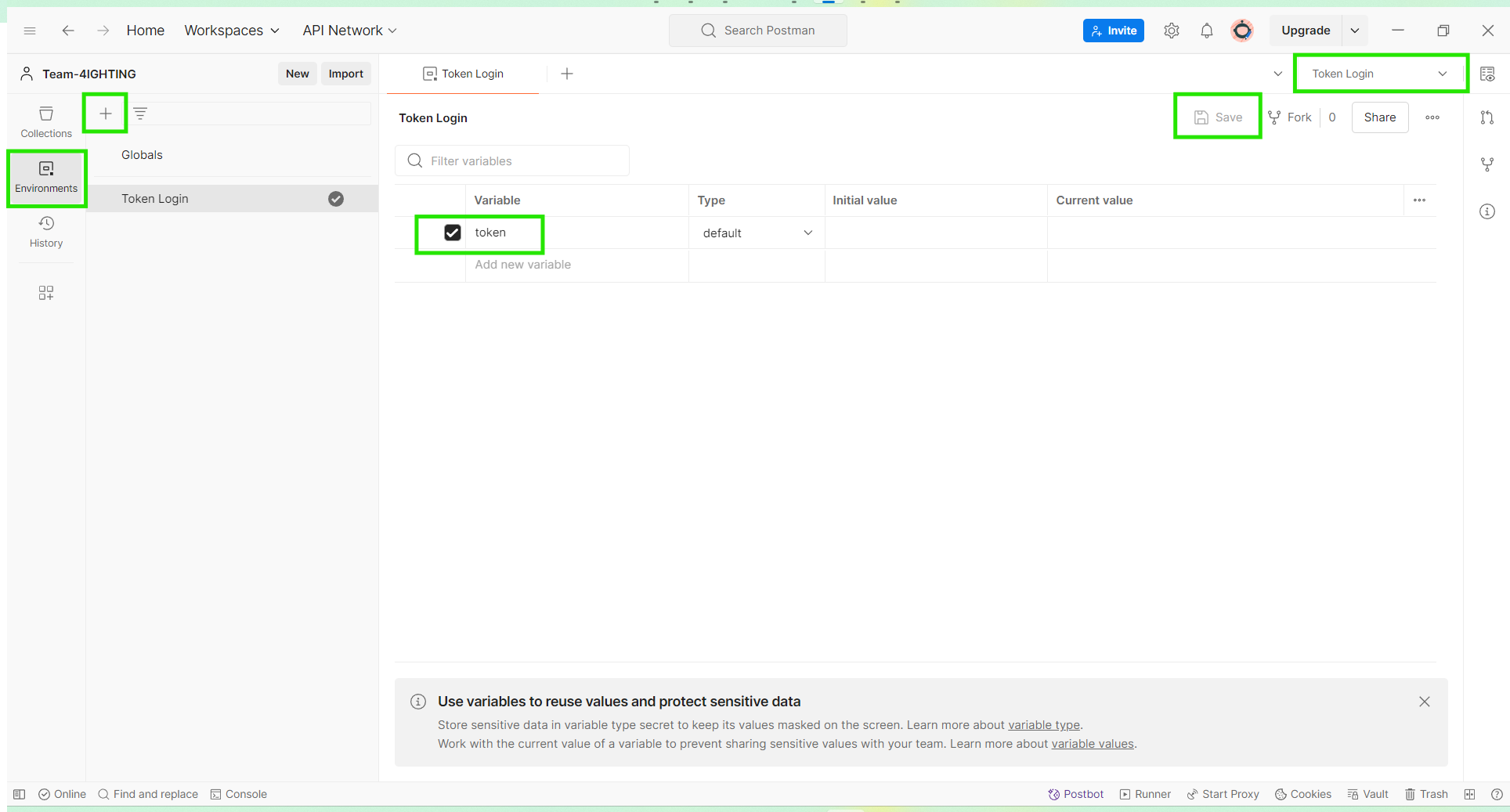 [Enviroments] → [+] → Variable에 변수명 입력 및 체크 → [Save] → 우측 상단에서 생성한 환경변수로 설정