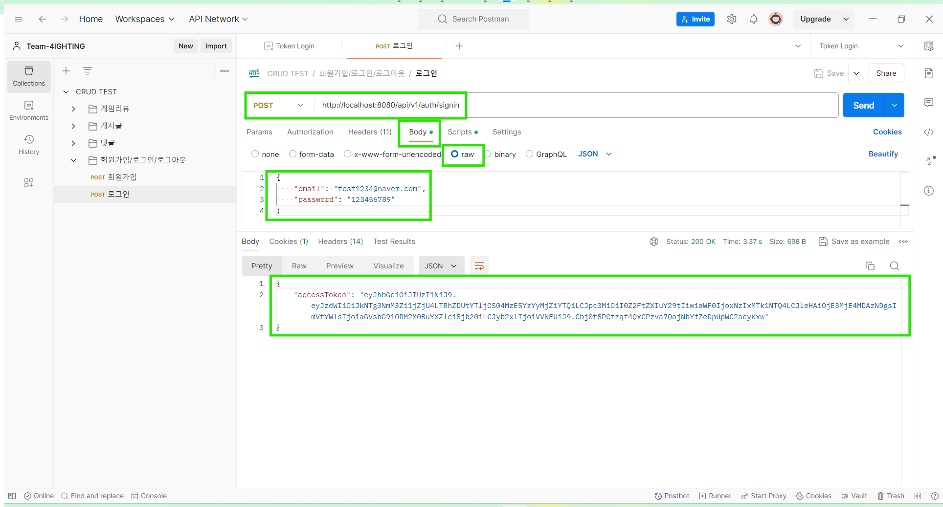 Request에 URL, Body를 입력해 응답 본문에서 token이 담겨오는 변수명 확인